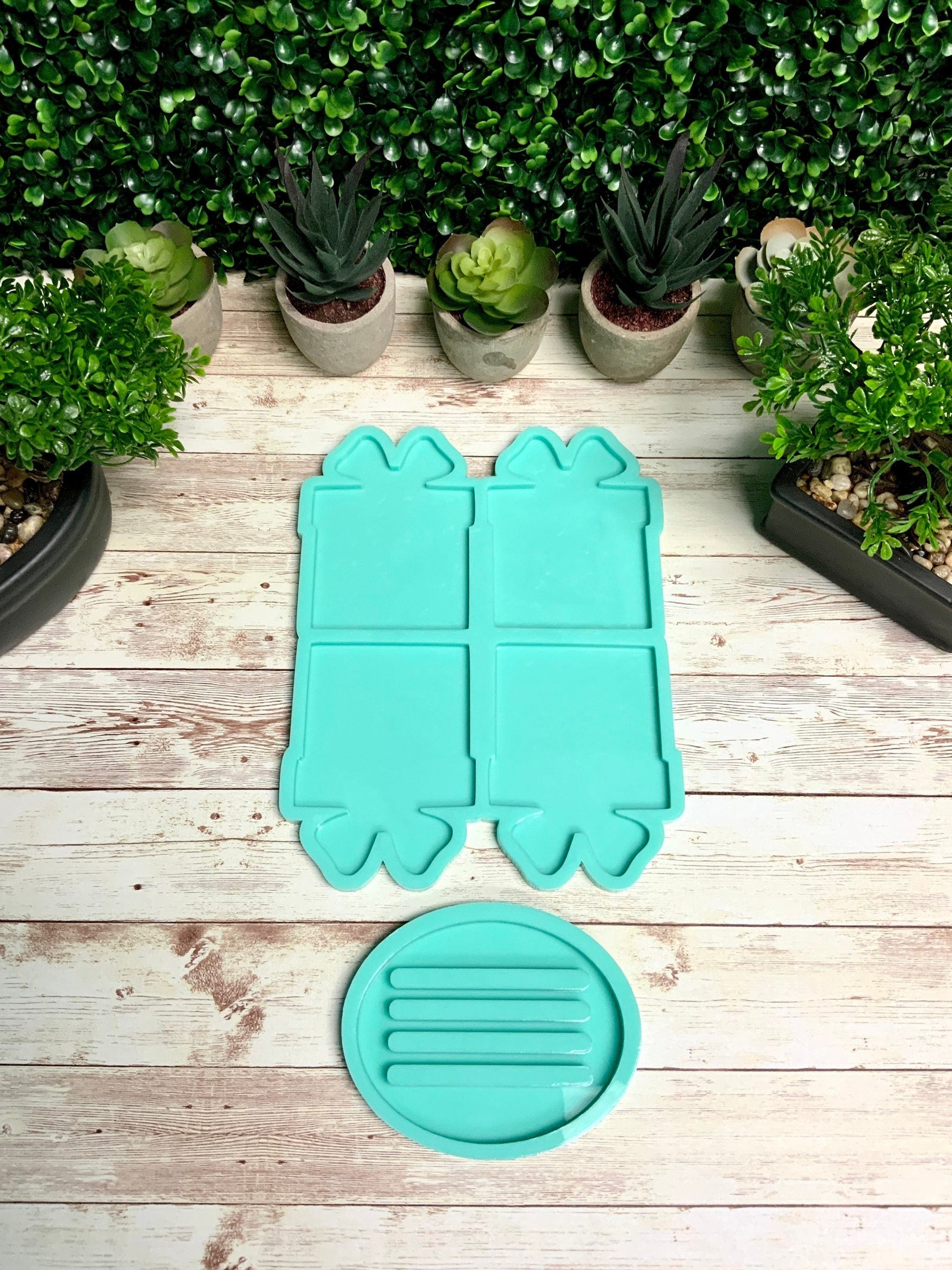 This listing is for a Present Coaster Mold Set with Holder Mold! This set comes with 4 mold cavities and an Oval tray stand with 4 slots to display your coasters. The coaster stand is 4.5" x 3.5" and 3/8" deep.