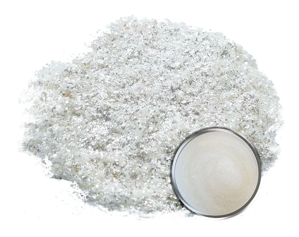 Snowflake is a beautiful large super light and fluffy metallic pigment. A great pigment for accents on projects. Our popular mica powder is ideal for DIY craft use, such as, epoxy, resin, woodworking, pen blanks, plastics, slime, watercolors, cosmetics, fishing lures, bath bombs, jewelry, melt and pour, lip balm, acrylic, polish, candle making, and MUCH more.